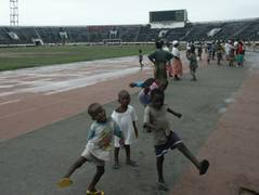 15:44:26Des enfants jouent dans le stade de Monrovia - Au coeur des combats durant la guerre civile du Libéria, des dizaines de milliers de personnes y avaient cherché refuge. Photo: Callie Long/ACT International